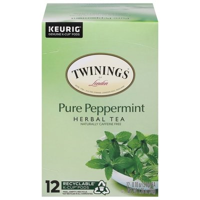Naturally caffeine free. Est 1706. 216 the strand. London WC2, England. A refreshing herbal tea expertly blended using only pure peppermint to deliver an invigorating tea with an uplifting aroma and fresh mint taste. Available in a wide variety of black, green and herbal K- cup pods. Sourced with twinings care. Sourced with care. Improving quality in the communities we source from. www.sourcedwithcare.com www.sourcedwithcare.com. how2recycle.info. For questions or comments, please contact us at: Twinings North America, Inc., www.twiningsusa.com/1-800-803-6695. Recyclable (Not recycled all communities).K-cup pods. Keurig genuine K- cup pods. Only genuine K- cup (Not recycled in all communities) pods are optimally designed by Keurig (not recycled in all communities) coffee maker to deliver the perfect beverage in every cup. To learn more, visit Keurig.com/genuineK-cuppod. Caution: Pod is hot. Allow to cool after use. Peel. Starting at puncture, peel lid and dispose. Empty. Compost or dispose contents. Recycle. Check locally (not recycled in all communities).