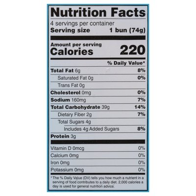 No artificial dyes or flavors. Per 1 Bun: 200 calories; 0 g sat. fat (0% DV); 160 mg sodium (7% DV); 4 g total sugars. Certified gluten free (Certified Gluten-Free by the Gluten-Free Certification Organization, www.gfco.org). gfco.org. No dairy, soy, tree nut, or peanut ingredients. Be BBQ ready. Get your burgers ready! This bun is soft, tender and gluten free. No wonder it's a BBQ staple. Toasted or fresh, they make any burger the best. udisglutenfree.com. how2recycle.info. SmartLabel: Scan for more food information or call 1-800-254-3768. Questions or comments, visit us at www.udisglutenfree.com or call 1-800-254-3768. For more information on Udi's Gluten Free visit us at udisglutenfree.com.