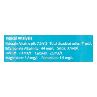 Typical Analysis: Naturally Alkaline pH: 7.6-8.2. Total dissolved solids: 74 mg/L. Bicarbonate Alkalinity: 44 mg/L. Silica: 37 mg/L. Sodium: 7.1 mg/L. Calcium: 7.1 mg/L. Magnesium: 3.8 mg/L. Potassium: 1.9 mg/L. Naturally alkaline electrolytes. Deep well water. Premium by nature. Waiakea Volcanic water originates in Hawai’i through both snowmelt and rain on the pristine summit of the active Mauna Loa volcano - one of the purest environments on Earth. Live Healthy: Filtered through Porous Volcanic Rock Natural Electrolytes and Minerals Naturally Alkaline. Live Sustainably: 393 Mill gal/day Source Sustainable Yield 100% Post Recycled Eco-bottle Certified CarbonNeutral. Live Ethically: For every liter you buy, Waiakea provides a week's supply of clean water to those in need while contributing to local Hawaiian non-profits in education and conservation. Kama’aha education initiative. Pump Aid water for life. Keiki steps a program by inpeace. Source: Kea'au Aquifer. waiakeasprings.com. For more information and to obtain additional consumer information relating to water quality, Including a bottled water report contact Waiakea at 1-855-WAIAKEA or visit waiakeasprings.com. BPA Free. Save the planet please recycle.