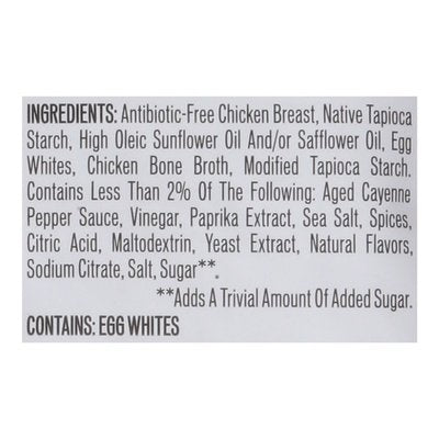 Crispy chips crafted from antibiotic-free chicken breast and tapioca starch. 10 g protein per serving. Certified gluten free. gfco.org. Paleo: Flavorful snacking. Good source of protein. Chips Crafted From: Real ingredients including chicken breast; egg whites; chicken bone broth. Chicken raised without antibiotics. Wilde is the first chip bold enough to create a delicious chip crafted from 100% all natural (No artificial ingredients; minimally processed) chicken breast. Our crispy buffalo style chips are everything you love about wing night minus the sauce covered fingers. Tangy buffalo meets spicy cayenne pepper for mouthwatering flavor that really packs a punch. (Blue cheese sold separately). Savor freely. Crunch wildely. Chicken used 100% Natural (No artificial ingredients: Minimally processed) raised without antibiotics no added hormones (There are no hormones approved for use in poultry by federal regulations). Packet enclosed to keep fresh; it is harmless and non-toxic but do not eat packet. Inspected for wholesomeness by U.S. Department of Agriculture. wildebrands.com. Facebook. Twitter. Instagram. (at)wildechips. Want to learn more. Made in USA.