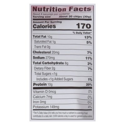 Crispy chips crafted from antibiotic-free chicken breast and tapioca starch. 10 g protein per serving. Certified gluten free. Good source of protein. Chicken raised without antibiotics. Himalayan on the flavor. Salt & chicken's here! Wilde is the first chip bold enough to create a delicious natural (No artificial ingredients; minimally processed) chicken breast. Our Himalayan pink salt chips creates a layers of flavor that showcase seasoning salt and crispy chicken. Savor freely. Crunch wildely. Chicken used contains no antibiotics or added hormones (There are no hormones approved for use in poultry by federal regulations). Packet enclosed to keep fresh; it is harmless and non-toxic but do not eat packet Inspected for wholesomeness by U.S. Department of Agriculture. wildebrands.com. Facebook. Twitter. Instagram. (at)wildechips. Want to learn more. Questions info(at)wildebrands.com. Made in USA.