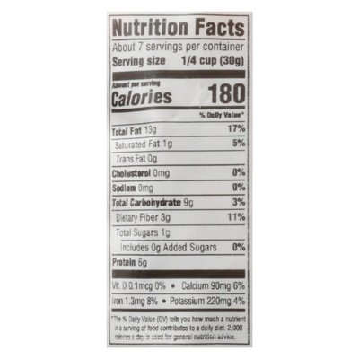 See nutrition information for fat content. Paleo friendly. Non-GMO. Non-GMO Project verified. nongmoproject.org. Just nuts. Eat because it's good! Plant protein. Superfood. Here at Woodstock we celebrate foods that make you feel great about what you buy, eat, and serve your family. Our ingredients are simple, satisfying, and farmed from sources you can trust. Our team has been at it for over 30 years bringing passion for Organic, Non-GMO, and totally delicious food to the table. This package is sold by weight, not volume. You can be assured of proper weight although some settling of contents may occur during shipping and handling. 100% Quality Guaranteed: Like it or let us make it right. That's our quality promise. 855-423-2630. woodstock-foods.com. woodstock-foods.com. Let's get social! (at)woodstockfoods. Instagram. Facebook. Twitter. Non BPA bag (Packaging produced without intentionally added bisphenol-A (BPA)). Printed with water-based ink and thermal transfer printing. Product of USA.